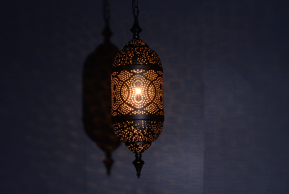 灯体采用哑光黑铁锻造,刻意保留手工捶打的凹凸肌理。镂空纹样暗藏玄机:顶部的细密圆孔模拟沙漠夜空的星斗,中段的卷草纹复刻波斯地毯的藤蔓,底部的尖角缺口则对应驼铃晃动的频率。当光源亮起,光线先撞击内壁的金色涂层,再从孔洞溢出时,竟带上了蜜糖般的琥珀光泽。