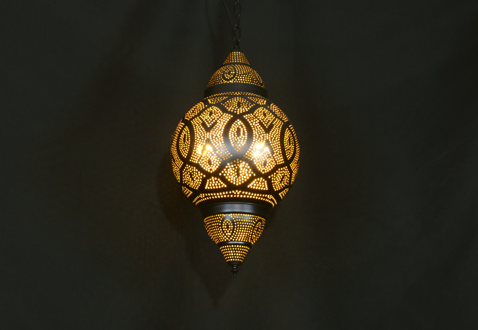 这盏吊灯如同一件从《天方夜谭》中走出的魔法器物,以独特的​​三层式结构​​演绎东方美学:顶部喇叭形灯罩如盛开的莲花,中部球形灯身密布繁复的镂空花纹,底部锥形坠饰则似倒悬的月光水滴。整体采用深色金属锻造,表面流转着若隐若现的鎏金光泽。