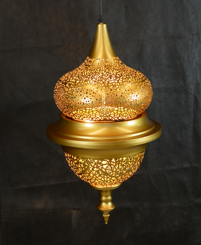 这盏吊灯宛如一座倒悬的微型宫殿穹顶,以璀璨的金色演绎浓郁的东方奢华美学。灯体采用精工金属锻造,整体呈现饱满的半球造型,表面覆盖着层层叠叠的伊斯兰风格镂空花纹——细腻的几何图案与藤蔓卷草纹交错缠绕,每一处雕刻都彰显着精湛的手工技艺。独特的穹顶造型灵感源于伊斯兰建筑,既保留传统韵味,又通过现代工艺呈现轻盈质感,当灯光亮起,暖黄光线从数百个镂空花纹中流淌而出,在墙面投射出斑斓的光影画卷,犹如为空间披上一袭会发光的波斯地毯.璀璨的金色涂层流转着温暖光泽,在纯白背景衬托下更显高贵典雅